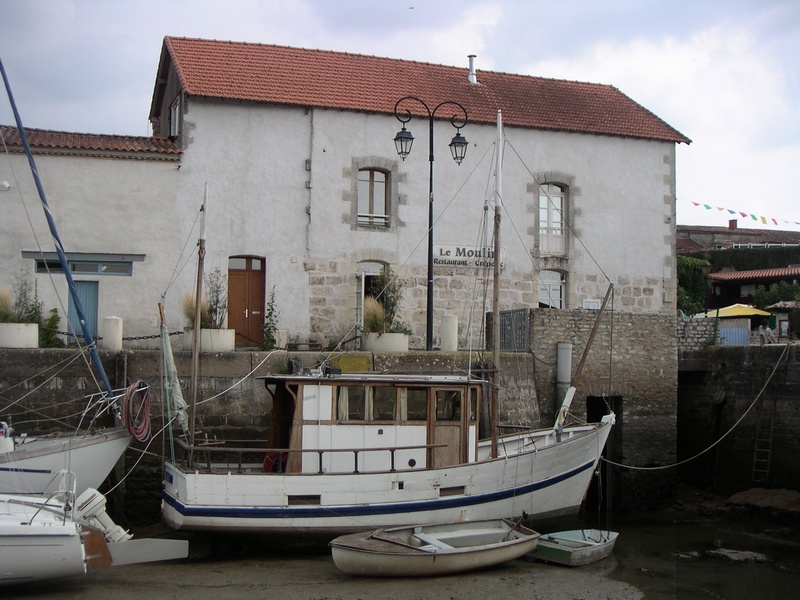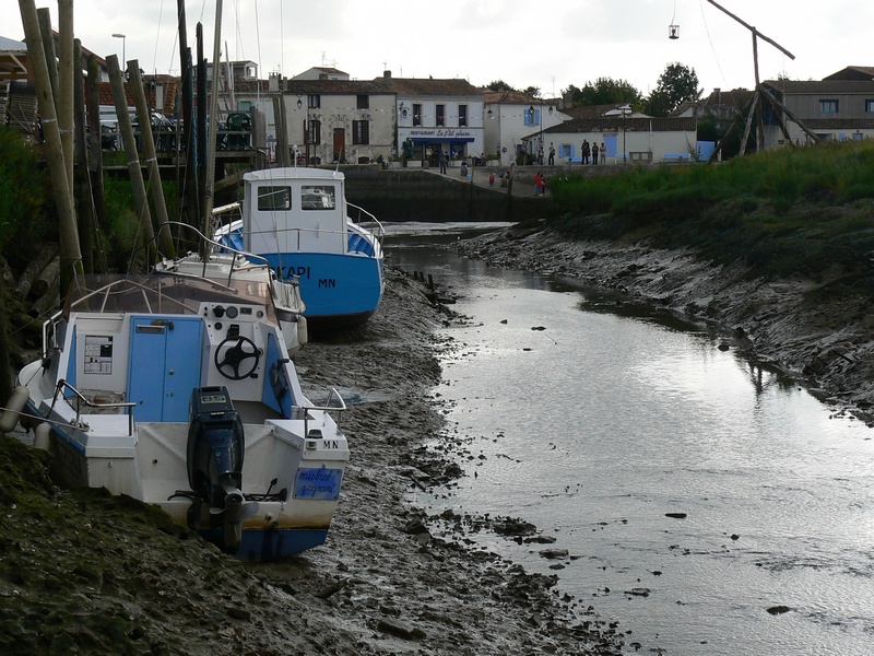 Ayant flâné parmi les boutiques de la rue piétonne, on débouche sur une place qui est aussi le port. Quelques restaurants la bordent, offrant une vue calme et dégagée sur le marais et les quelques bateaux, à flot ou échoués au gré de la marée, qui se sont faufilés par le chenal.