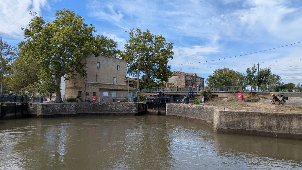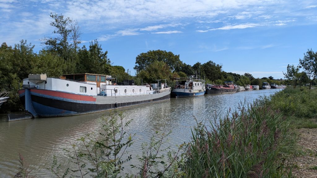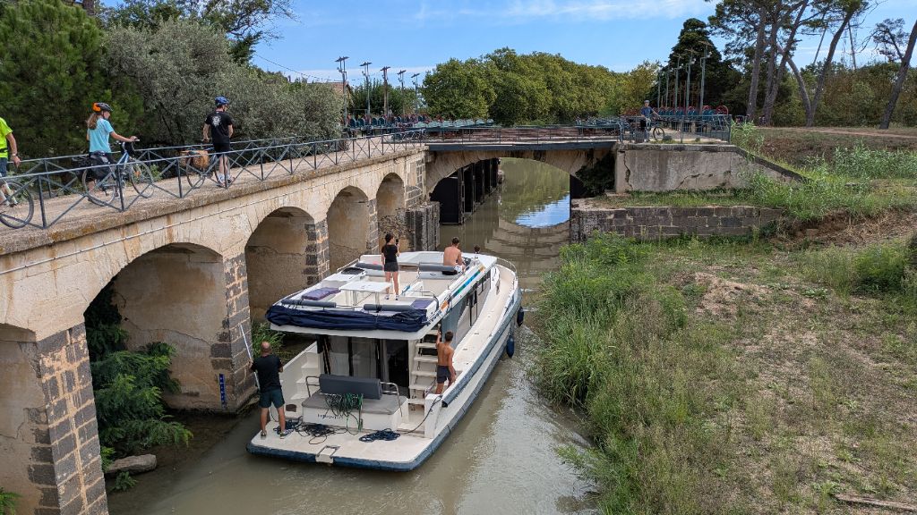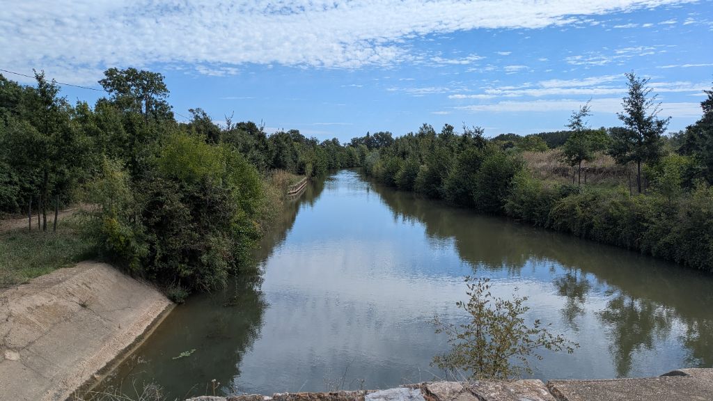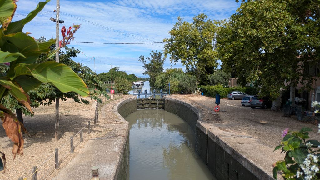 Au départ de Béziers, la qualité de la piste s'améliore nettement et nous avançons à bonne allure. En contrepartie, le paysage s'avère moins pittoresque et attachant que les vignobles minervois de la veille. Un panneau, à l'écluse de Portiragnes, nous informe de l'évolution du trait de côte au cours des deux derniers millénaires : Béziers se trouvait alors en haut d'un delta aujourd'hui disparu.