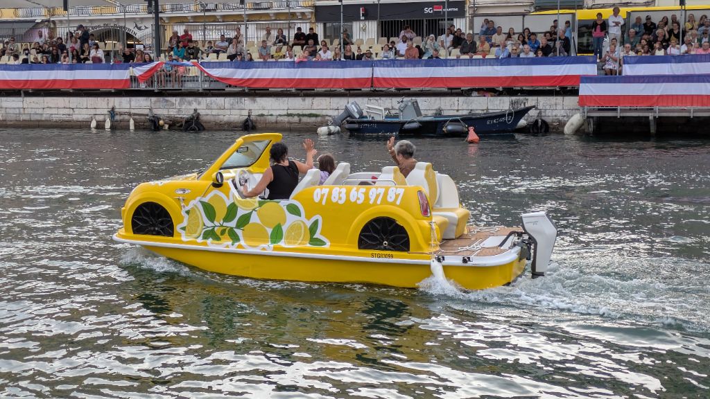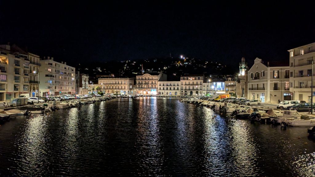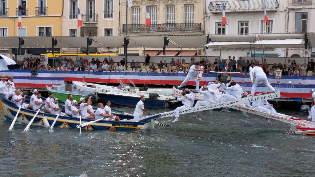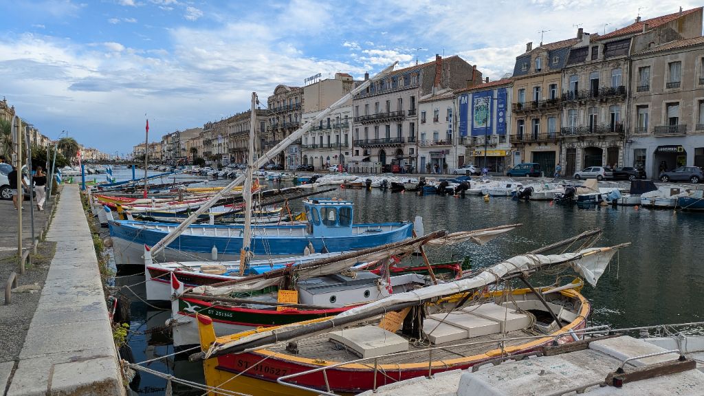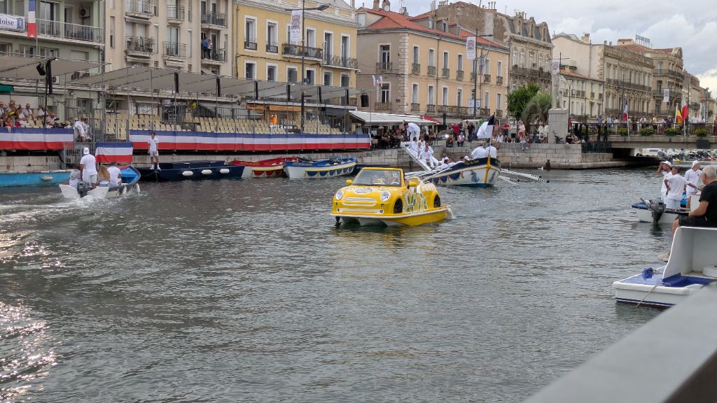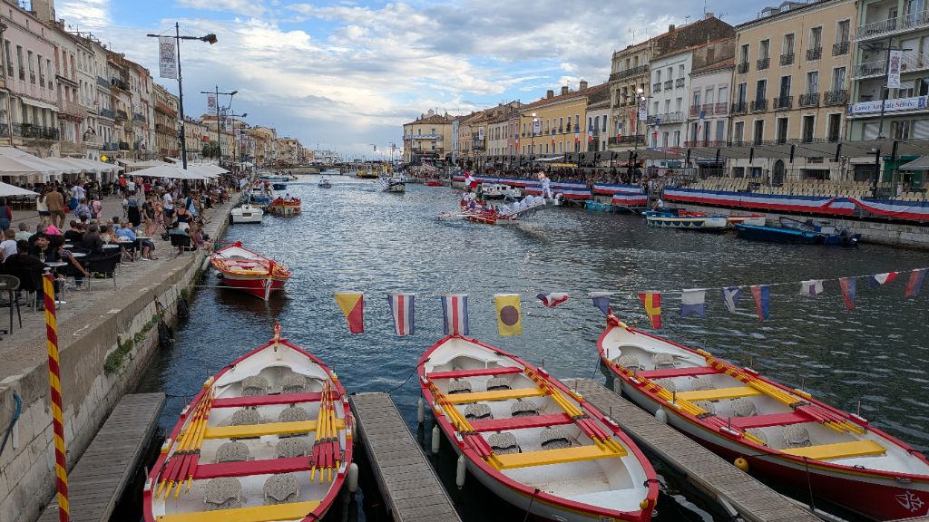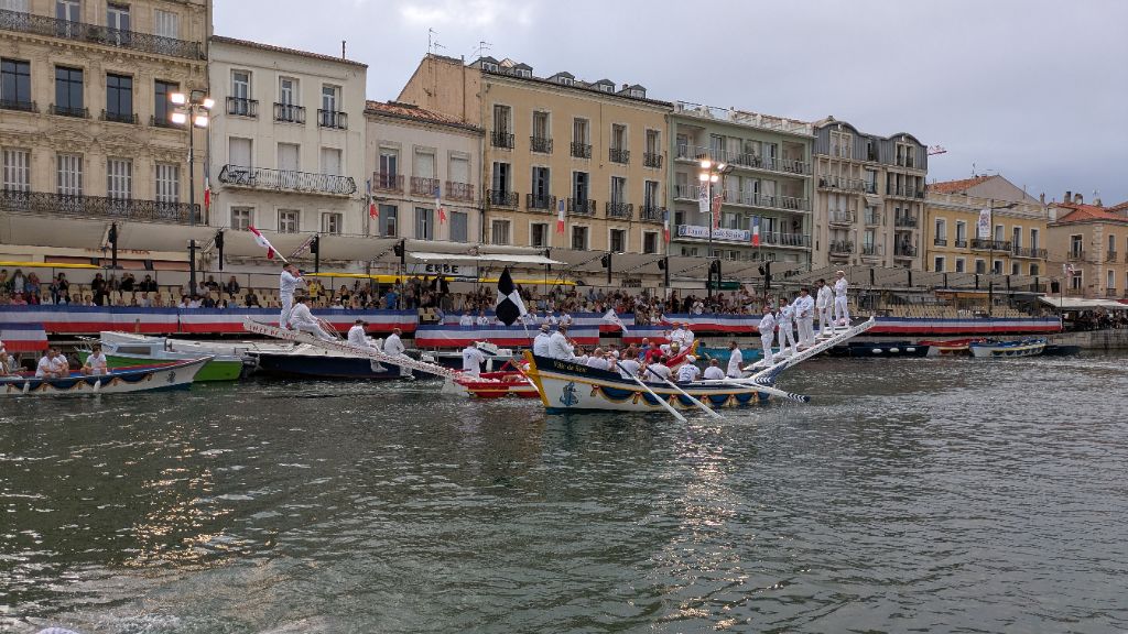 Après avoir regardé l'extrémité du canal, nous rebroussons chemin pour retrouver une piste qui nous mène jusqu'à Sète. Une fois installés à l'hôtel, nous repartons à pied vers les canaux du centre ville où se déroulent des joutes nautiques.