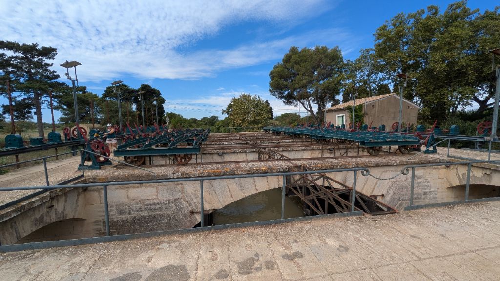 Plus loin, le canal croise le lit du Libron. Un dispositif complexe de portes permet de mélanger ou de séparer les eaux en fonction du niveau de la rivière.