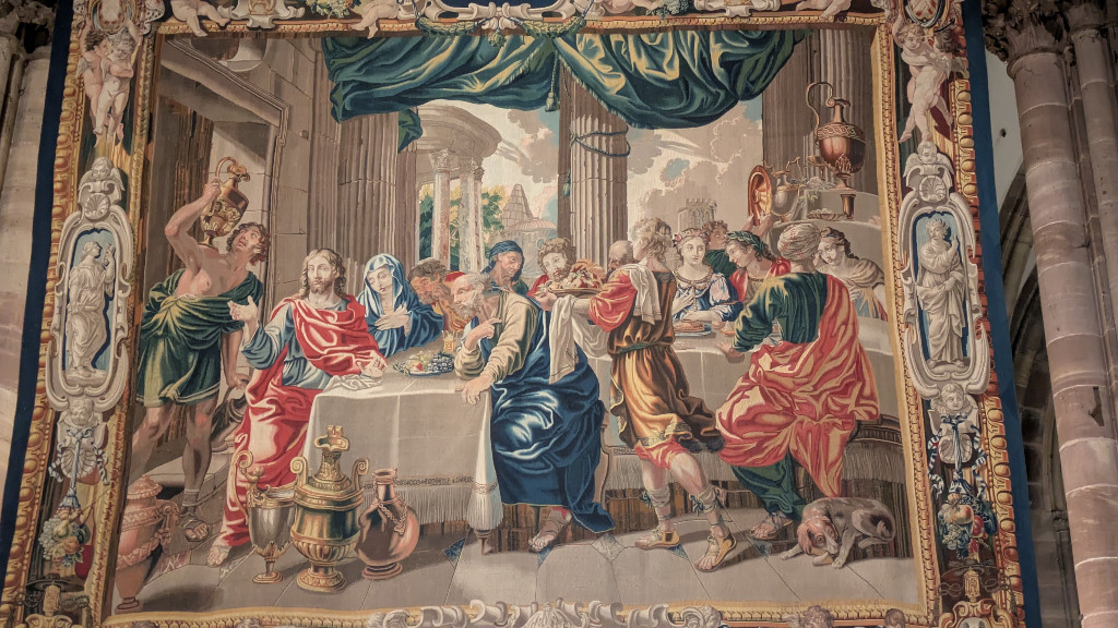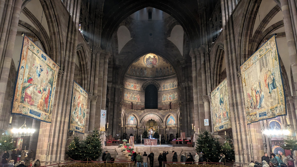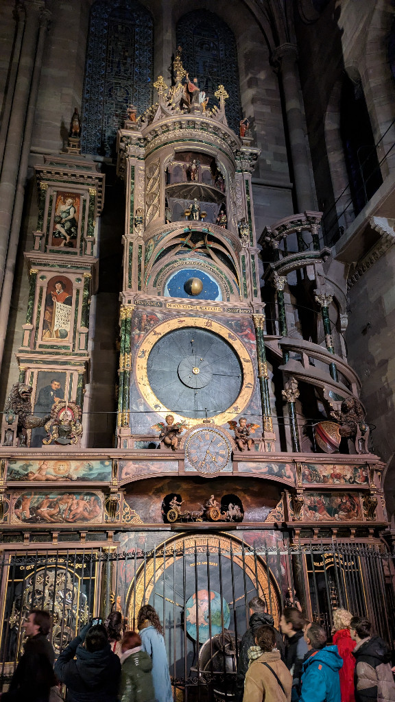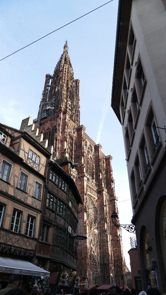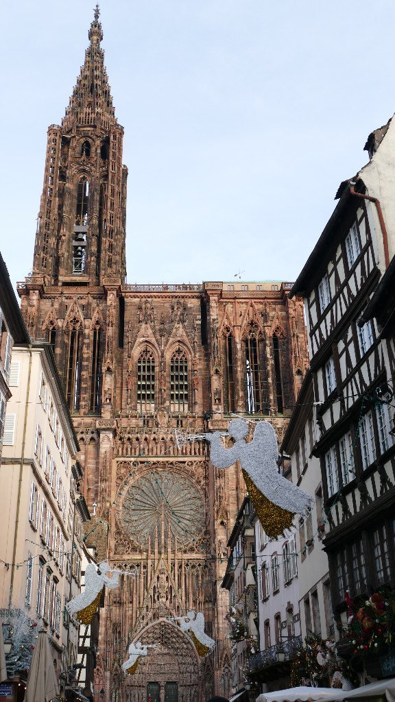 Colosse en dentelle rose, la cathédrale est enserrée dans une place qui semble trop petite pour elle. Une seule rue offre un peu de recul pour en apprécier les dimensions. L'intérieur est tout aussi impressionnant : une brume flotte sous les hautes voutes où disparait un orgue comme suspendu, tandis que les tapisseries et le rose de la pierre procurent un peu de chaleur. Dans le transept sud, l'horloge astronomique surveille et ponctue l'écoulement du temps.