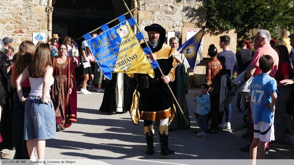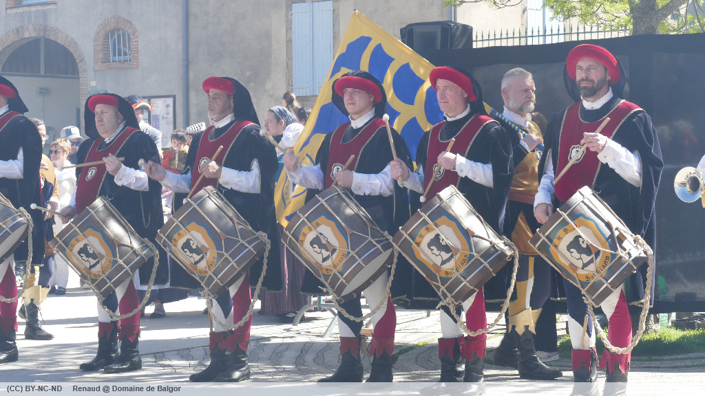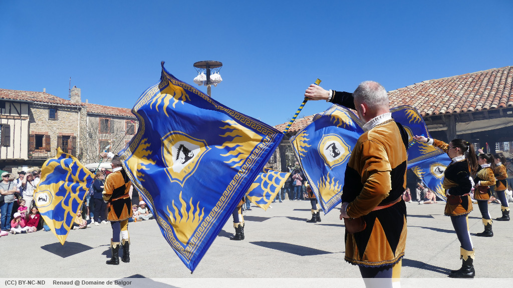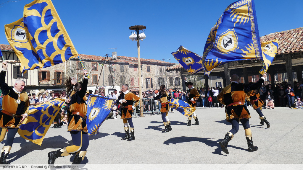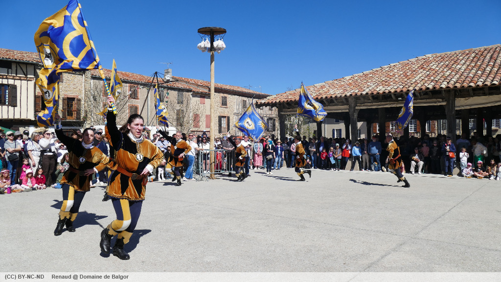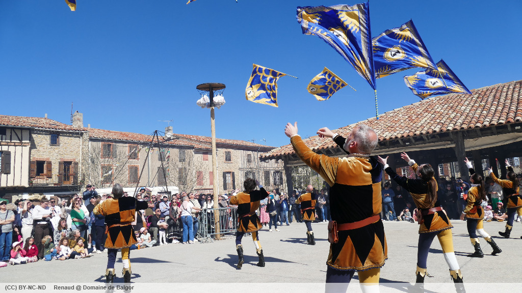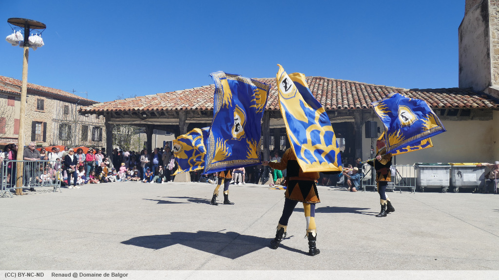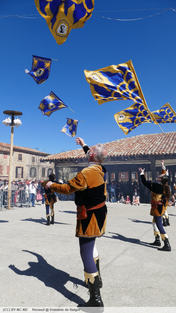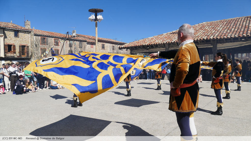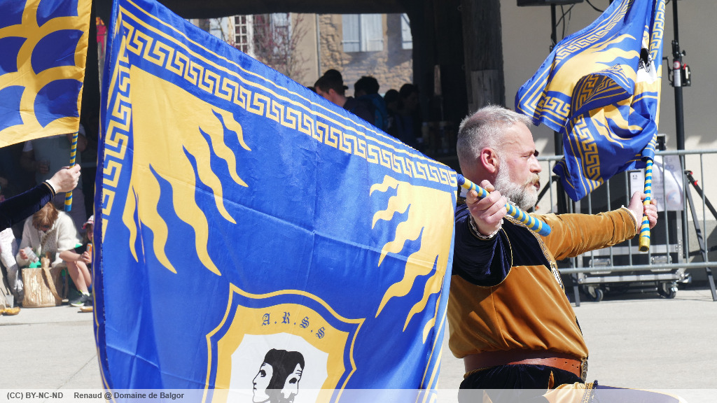 Renaud 6 avril 2026 Venus de Subbiano en Italie, un groupe de lanceurs de drapeaux jonglent avec des oriflammes bleus et jaunes au son des tambours et des trompettes qui les accompagnent, lors de la 50e fête de la cocagne à St Félix Lauragais.