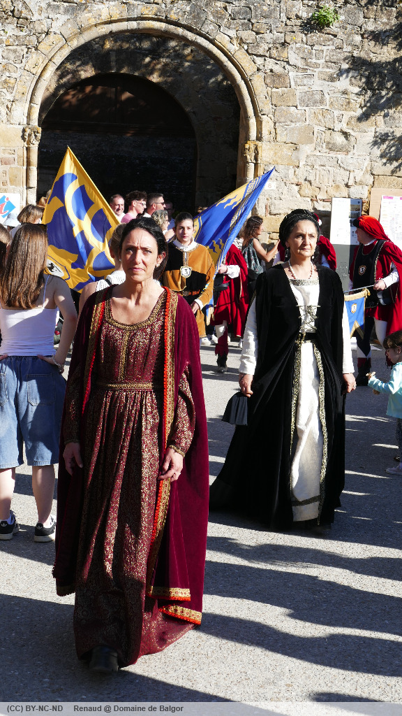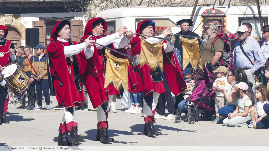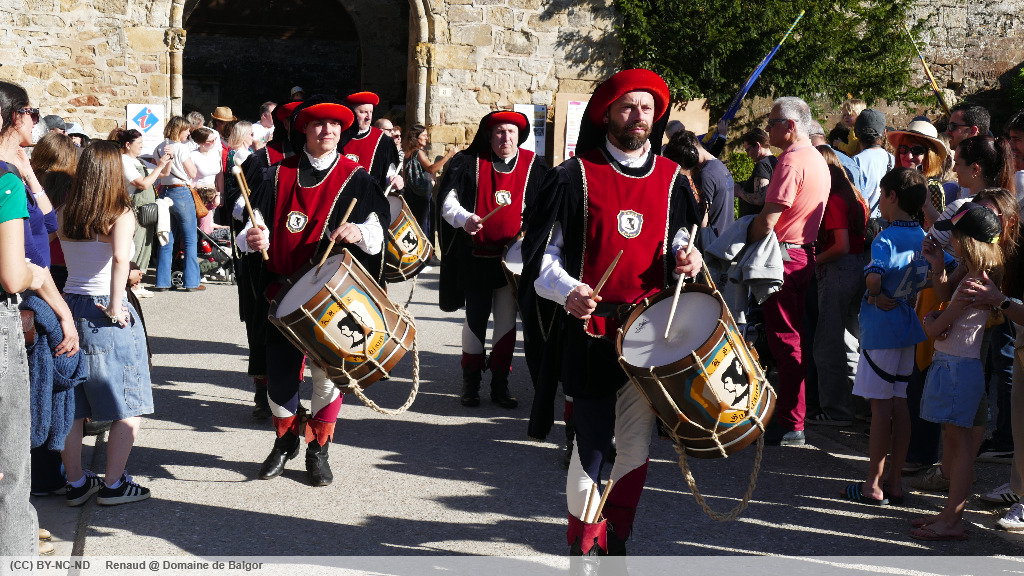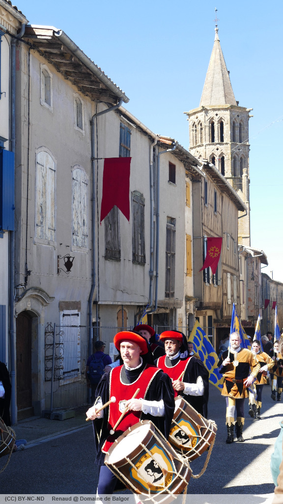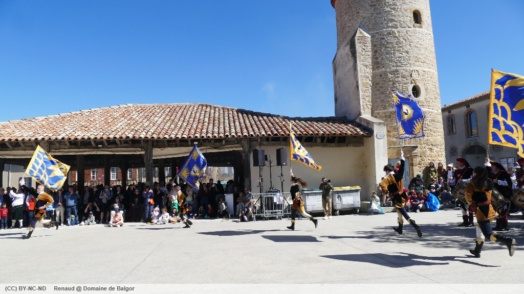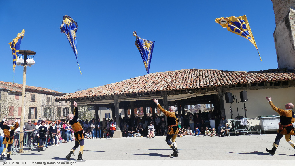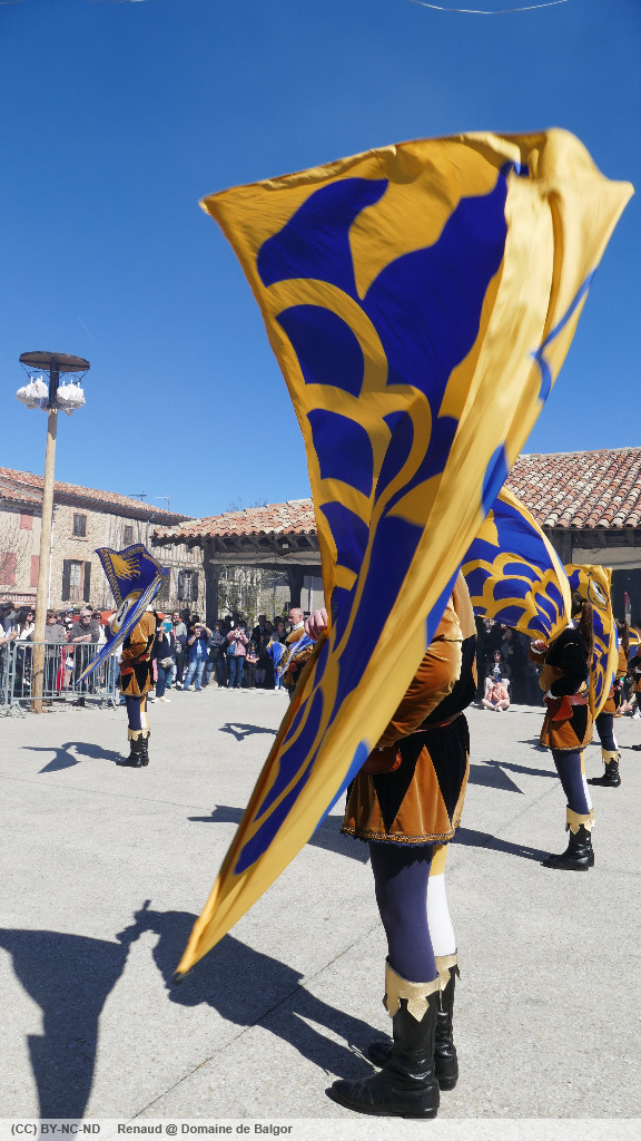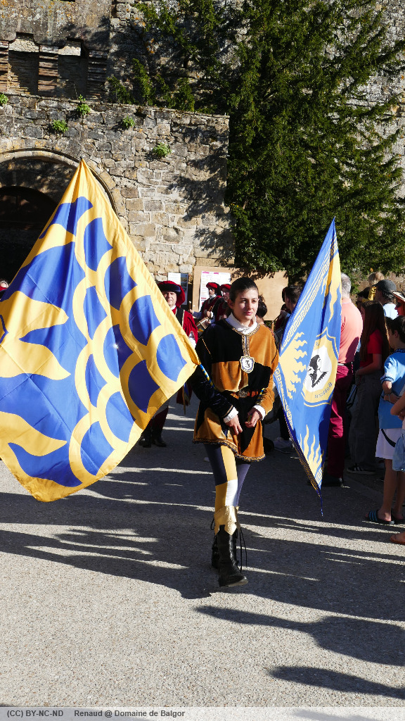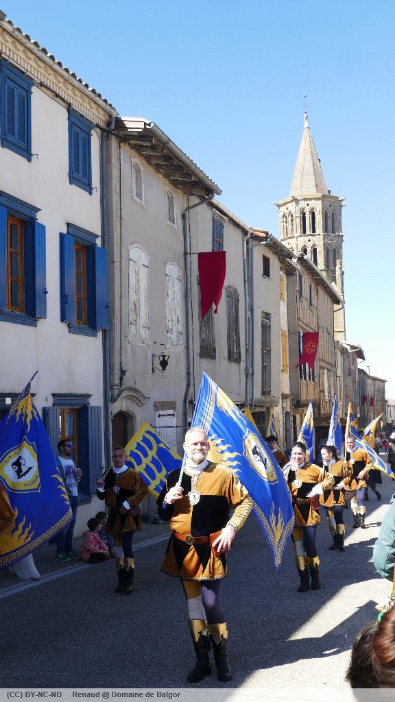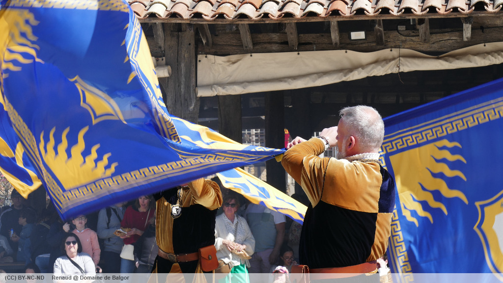 Renaud 6 avril 2026 Venus de Subbiano en Italie, un groupe de lanceurs de drapeaux jonglent avec des oriflammes bleus et jaunes au son des tambours et des trompettes qui les accompagnent, lors de la 50e fête de la cocagne à St Félix Lauragais.